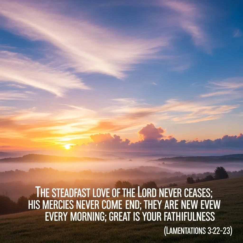 - Lamentations 3:22-23: "Because of the Lord's great love we are not consumed, for his compassions never fail. They are new every morning; great is your faithfulness." These verses reassure us that God’s mercy is renewed daily, giving us reason to hope each morning.